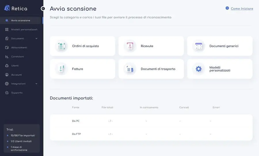 Carica ordini, DDT e altri documenti su Retica, manualmente o in automatico tramite API/protocollo FTP. Supporta PDF, JPEG e PNG, gestisce lingue e formati diversi.